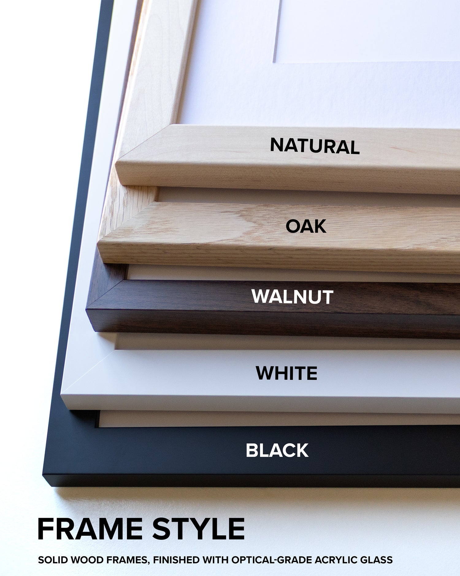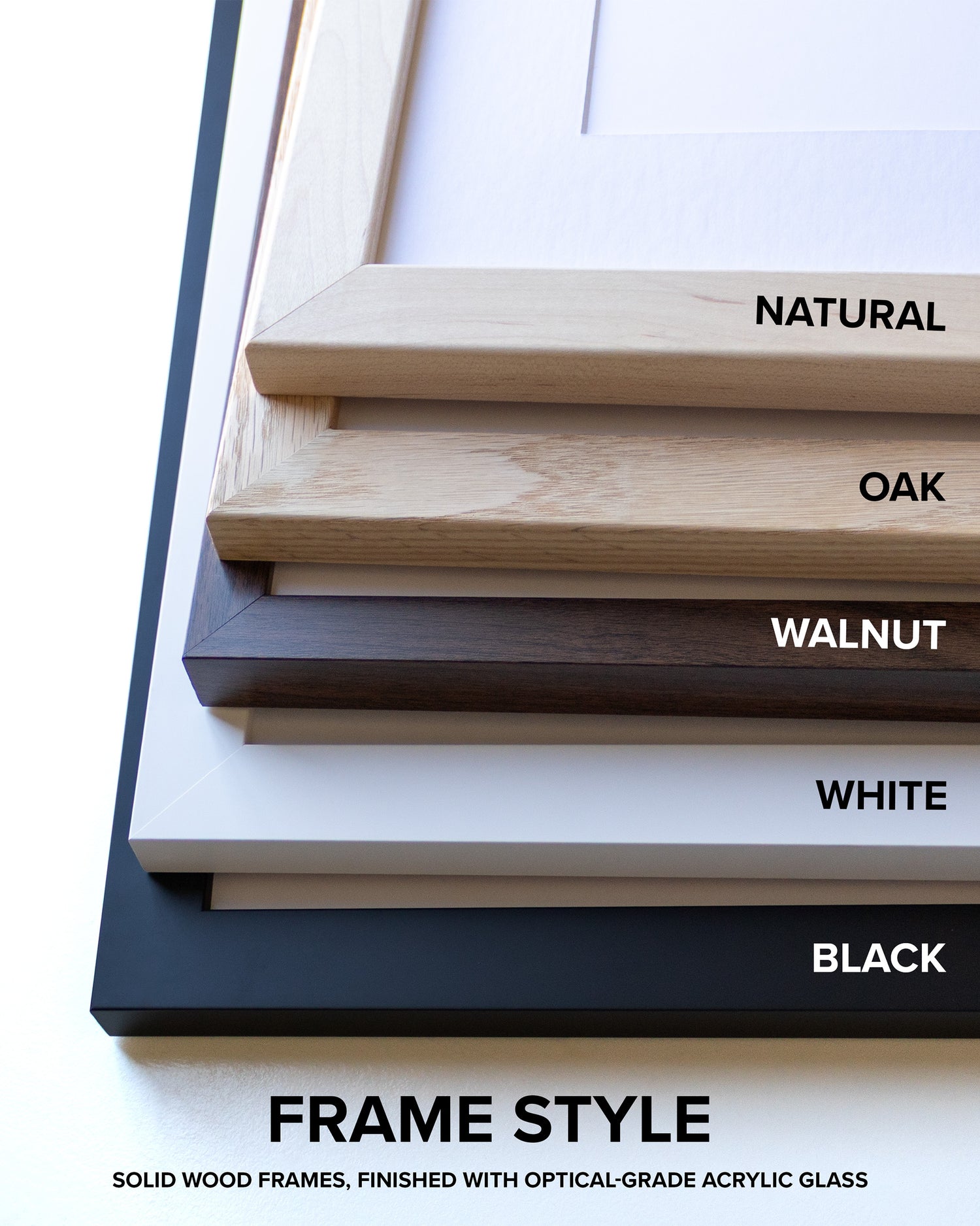 High-quality frames are created from a durable wooden core and comes in two modern color options - black and natural wood. Standard framed pieces are 1.25" wide and .875" in depth. The Walnut Frame is .875" wide and 1.25" in depth.